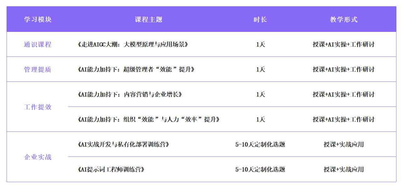 我们的培训内容涵盖如何构建数字化组织能力和人才储备,以及如何探索AI与业务结合的价值,创新业务场景。
