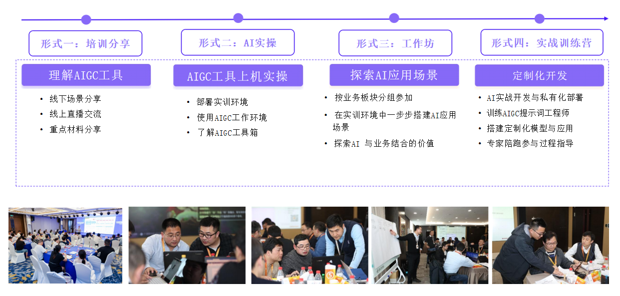 培训形式包括培训分享、AI实操、工作坊和实战训练营,以多种形式满足不同学习需求。