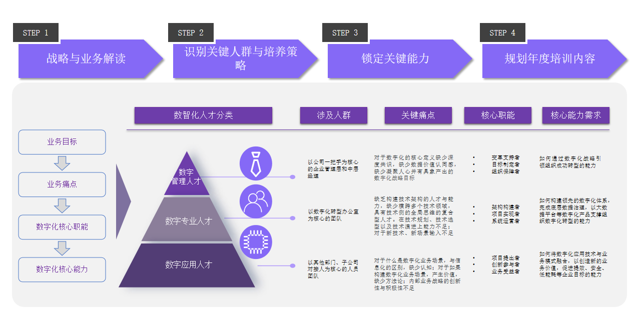 数字化人才培养规划咨询服务,帮助企业识别关键人群与培养策略,锁定关键能力,规划年度培训内容。